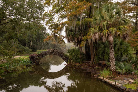 Bridge over a river duing a foggy morning. Taken in City Park, New Orleans, Louisiana, United States.