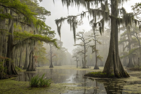 the swamp, captured in this charles white-inspired photograph, showcases a lush expanse of vegetation reminiscent of national geographic's stunning imagery. with a touch of southern gothic influence, the photo transports viewers to a mysterious and captivating world teeming with life. ai generated