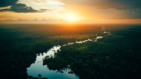 Winding River Delta, Aerial View of Lush Wetlands, Waterways, and Natural Beauty at Sunset