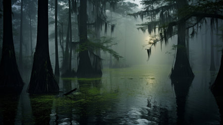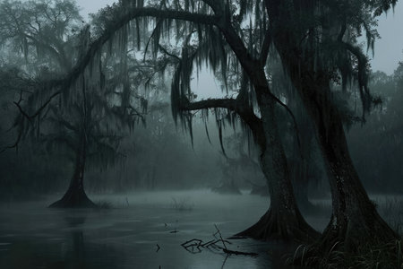 A foggy swamp with numerous trees covered in mist, creating an eerie and mysterious atmosphere, Haunted bayou with crooked trees, mist and swamp monsters, AI Generated