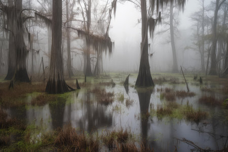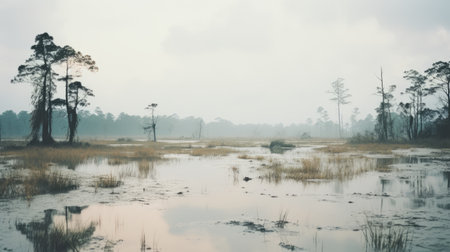 the fog blankets the marsh of west virginia, creating an ephemeral installation reminiscent of australian tonalism and the art of the ivory coast. this photograph captures the essence of new american documentary photography, with its atmospheric color washes and depiction of decaying landscapes. the uhd image showcases the intricate details of this captivating scene. ai generated