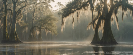 Ethereal sunbeams pierce through a thick morning fog, silhouetting a majestic cluster of bald cypress trees draped in Spanish moss in a swamp. The moody and atmospheric scene captures the mysterious beauty of a southern bayou at sunrise.