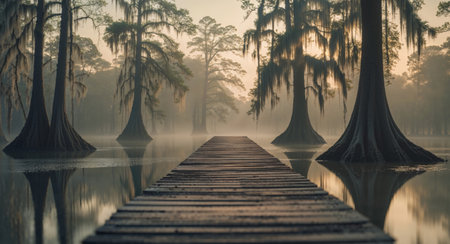 AI Generated. Empty Wooden Pier Overlooking a Serene Swamp with Cypress Trees in Soft Focus