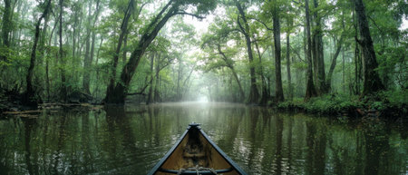 Peaceful canoe ride through a mist-covered forest river with morning sunlight filtering through trees