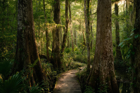A wooden boardwalk winds through a lush subtropical forest, with tall cypress trees and vibrant greenery, inviting nature lovers to explore this tranquil haven, Southeast, Humid Subtropical habitat