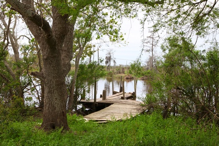 Tranquil bayou scene in Vacherie area featuring water, grasses, and tall sparse trees.