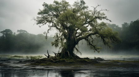 a tree stands by a mist-covered river in the midst of a serene lake. this national geographic-inspired photo captures the essence of southern gothic, with its detailed depiction and revived historic art forms. the lovecraftian atmosphere adds a touch of mystery, while the rtx technology enhances the visual experience. the image exudes an old-timey charm that transports viewers to another era. ai generated