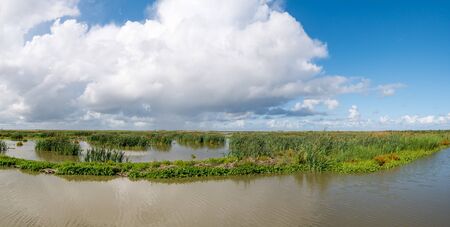 Panorama of marshes on manmade artificial island of Marker Wadden, Markermeer, Netherlands