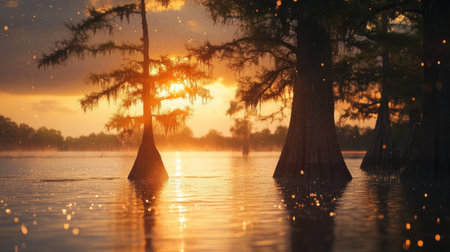 Sunset Over a Misty Swamp with Cypress Trees and Water Reflections, AI Generated