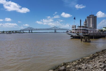 New Orleans, Louisiana - June 17, 2014: View of the Mississippi river from the city of New Orleans riverfront, with a Mississippi Steamboat and the Great New Orleans Bridge on the background in New Orleans, Louisiana.