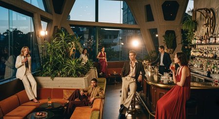 A stylish bar interior with people socializing, featuring modern furniture, warm lighting, and a well-stocked bar