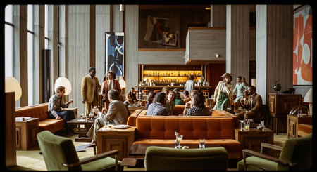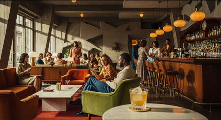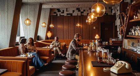 A stylish retro bar interior with warm lighting, featuring patrons enjoying drinks, modern furniture, and a vintage telephone