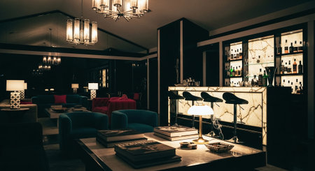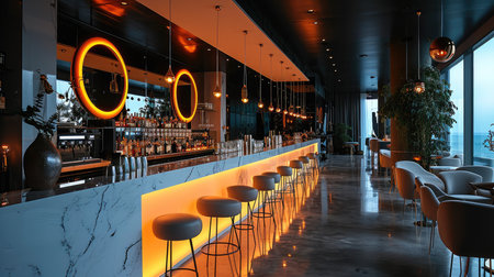 A beautifully designed bar interior featuring stylish seating and elegant decor. The modern space creates a vibrant and inviting atmosphere perfect for relaxation.