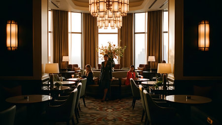 a luxury cafe, adorned with ornate decor and exquisite lighting. The composition conveys the opulent atmosphere of high-end dining