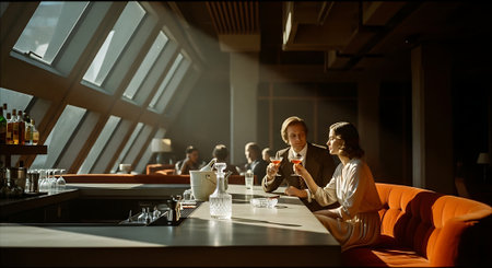 A stylish retro bar interior featuring plush orange seating, a well-stocked bar, and warm lighting, with two patrons engaged in conversation