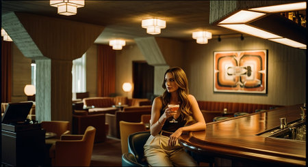 A woman sits alone at a dimly lit bar with a drink in hand