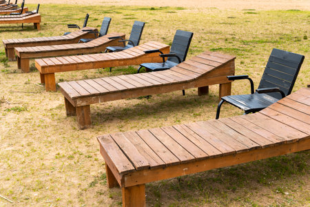 wooden deck chairs and chairs on the sandy beach of the lake.