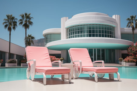 Two pink retro chairs sit by the edge of a turquoise swimming pool, with a large white house with curved walls and glass windows in the background.