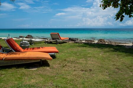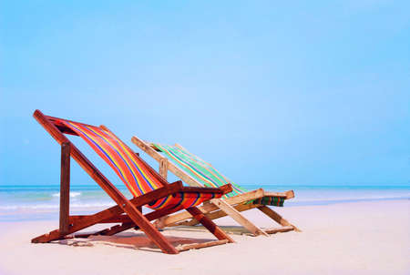 Beach chairs on tropical vacation, travel to sea concept