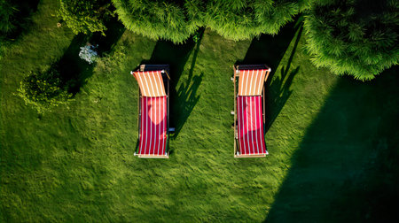 Aerial view of two deck chairs on green grass in a garden