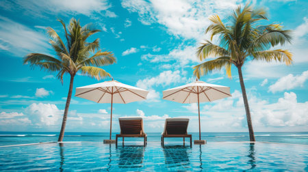 The edge Luxury swimming pool with white fashion deckchairs on the beach., Exterior design. Generative AI
