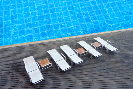 A shot composition of a group of five sun loungers in a swimming pool terrace