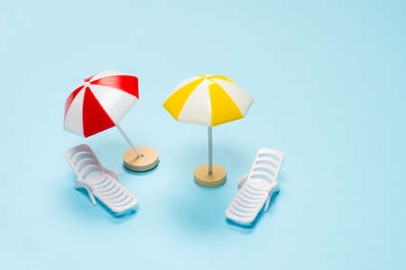 Top view of beach chairs and umbrella, Summer concept, Minimal scene. 3D rendering.