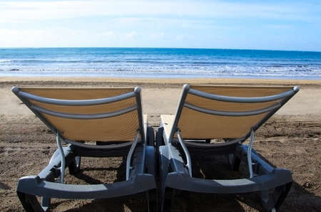 Two sunbeds on a beautiful beach in Tenerife, Canary Islands. Concept for vacations or tourism