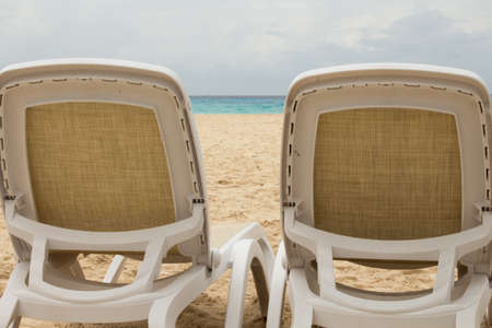Two pool chairs on the beach of the Caribbean Sea.
