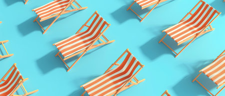 A pattern of orange beach chairs on a blue background. Illustration of a summer concept.