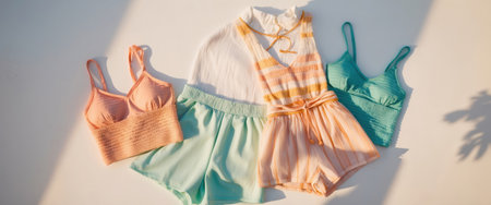 pastel flat lay outfit, gray tee and yellow shorts with matching bucket hat, gentle warm lighting, minimalist composition, modern lifestyle concept