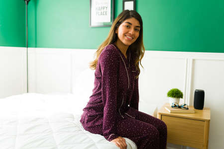 Portrait of a gorgeous latin woman looking at the camera and smiling after waking up in the bedroom