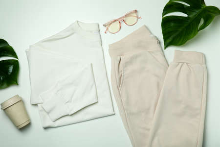 Flat Lay with women casual outfit on white bed sheet, top view,