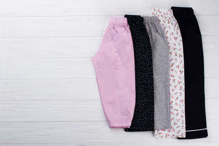 Pile of girls pants on white wooden rack table. Different sizes and colors, last items. Sale concept, copy space for text.