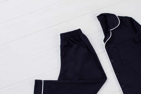 Boys dark blue pajama set. Folded shirt and pants on white table. Simple and elegant sleeping garments.