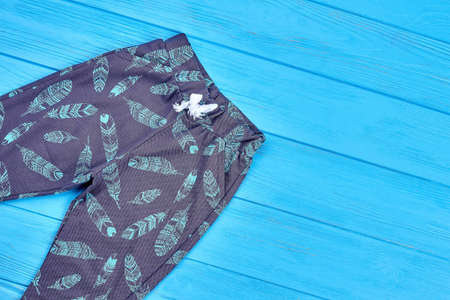 Patterned pants for baby girl. Folded dark blue summer casual pants in vintage print for little girl, wooden background.