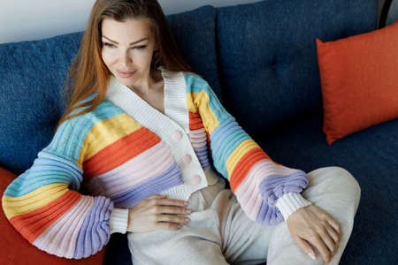 Dreamy woman at home sitting on floor. Lifestyle female portrait at home.