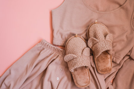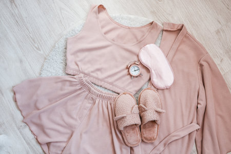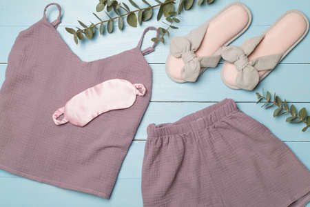Flat lay composition with house slippers, sleeping mask and pajamas on light background