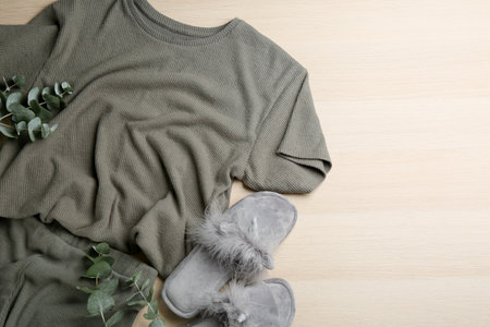 Pair of fluffy slippers, pajamas and space for text branches on wooden background, flat lay. Comfortable home outfit
