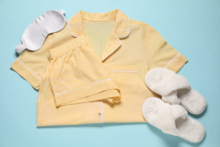 Stylish yellow pajamas, slippers and sleeping mask on light blue background, flat lay