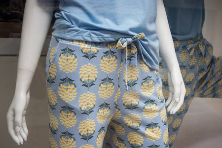 Closeup of blue and yellow pajamas on mannequin in a fashion store showroom
