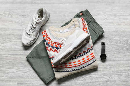 Casual Clothing Arrangement on Wooden Floor With Sneakers