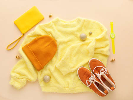 Warm sweater, shoes, accessories and Christmas balls on color background