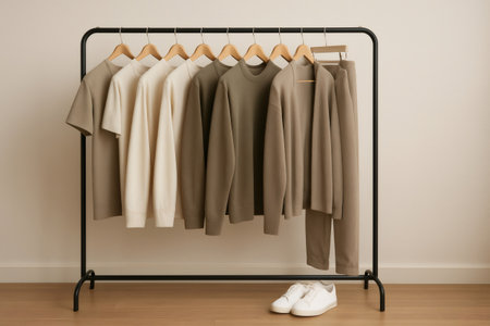 Neutral color clothing hanging on a minimalist black wardrobe rack with white sneakers underneath, promoting a sustainable fashion concept