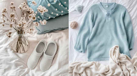 Brighten your living space with cozy home decor featuring a knitted sweater, soft slippers, and fresh flowers, creating a relaxing atmosphere.
