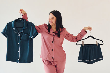 Holding blue clothes in hands. Cheerful young woman in pajamas standing indoors at daytime
