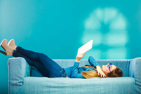 Modern technology education internet concept. Fashion student girl in glasses with tablet relaxing on blue color