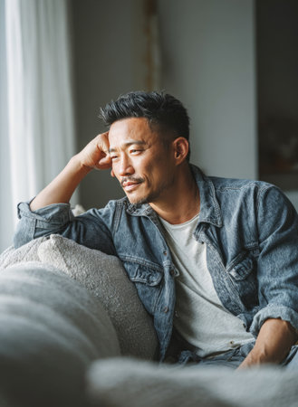 Asian man lost in thought while sitting on comfortable sofa, gazing out window in peaceful contemplation