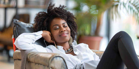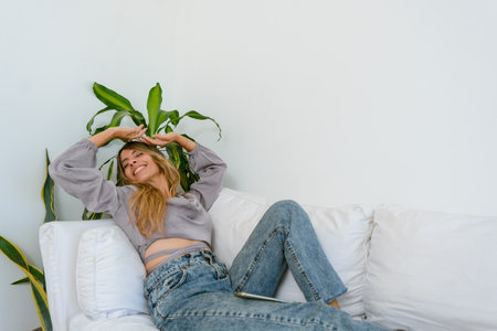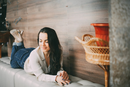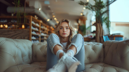 A beautiful young woman sits relaxed on a couch in a modern, cozy living space. The scene is tranquil and inviting.