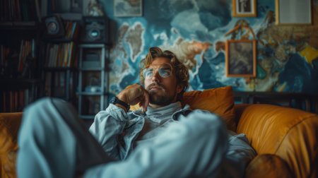 A man sits comfortably on a couch, lost in deep thought, with an artistic world map in the background, evoking a sense of introspection.
